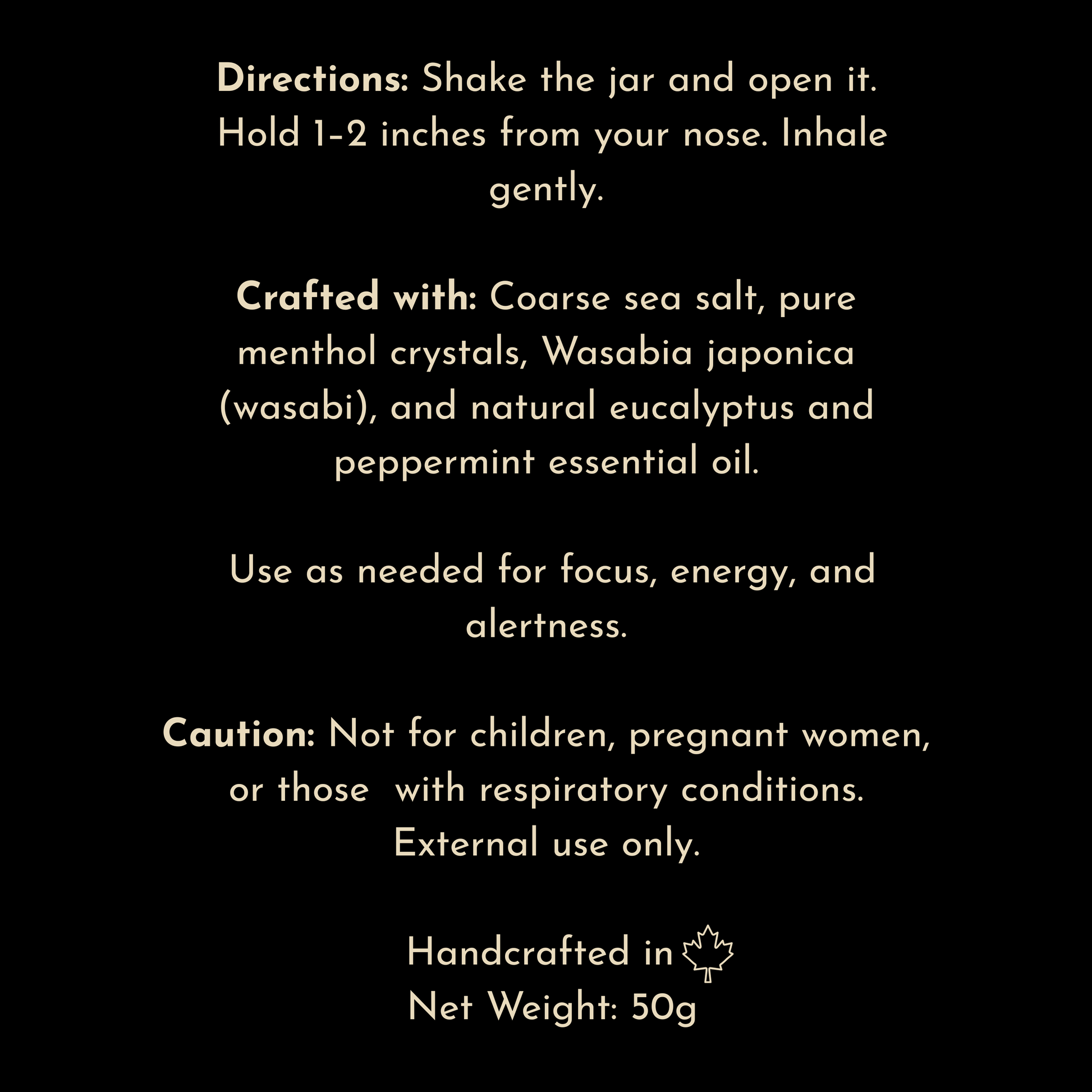 Powered by menthol crystals, wasabi root, and invigorating essential oils, this natural inhalation blend delivers a sharp, sensory wake-up without any of the toxic chemicals.